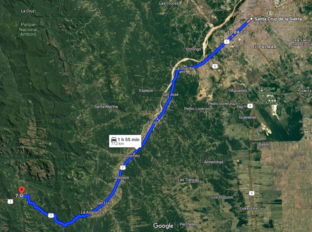 Das Tiefland liegt etwa zwei Stunden, das Hochland etwa fünf Stunden von Santa Cruz entfernt.